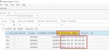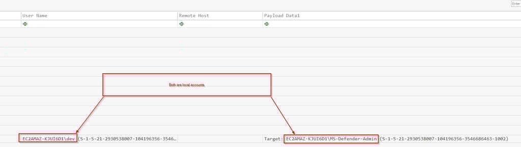 This event will be under the Windows Security Event log, we are looking for event 4720, New account creation. We see there was one account created by the dev account, MS-Defender-Admin. This fits in with the normal attack modus operandi, they prefer to choose account names that could blend in. How many accounts are on the average Windows box and most people are unaware of what is normal. TO find evil you need to know normal.