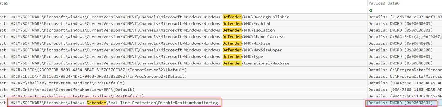 To break this down if this registry is turned from 0 (off) to 1 (on) it is turning off Windows Defender, the security solution on this device. DWORD 0x00000001 is on and all zeros (except for the x in 0x00) would be off. Look at the time this occurred, you have your answer.
