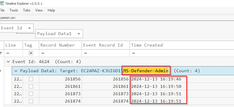 For this we need to pivot back to the security log for successful logons under event 4624. Use the filter option to narrow the column down to the targeted account. You'll be presented with four times, use the first one.
