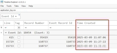 .\EvtxECmd.exe -f "C:\Users\Administrator\Desktop\Start Here\Artifacts\C\Windows\System32\winevt\logs\Application.evtx" --csv C:\Users\Administrator\Desktop\ --csvf application_log.csv