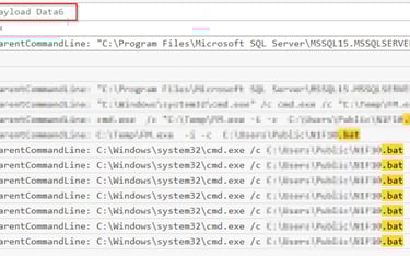 Batch files commonly have a .bat extension, using that as our search criteria we find several Sysmon Event ID 1 (process creation) where a batch file is in use (check the Payload Data 6 column).