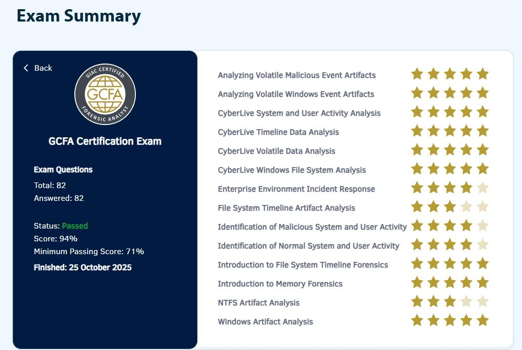 The GIAC Certified Forensic Analyst exam was a beast — easily the most difficult certification I’ve taken to date (as of December 2025). The challenge wasn’t just the material itself (though that proved a monumental task). At the time, I was still early in my Windows forensics journey, juggling an ambitious workload, and balancing life as a father and husband. Even so, I managed to walk away with a 94%.